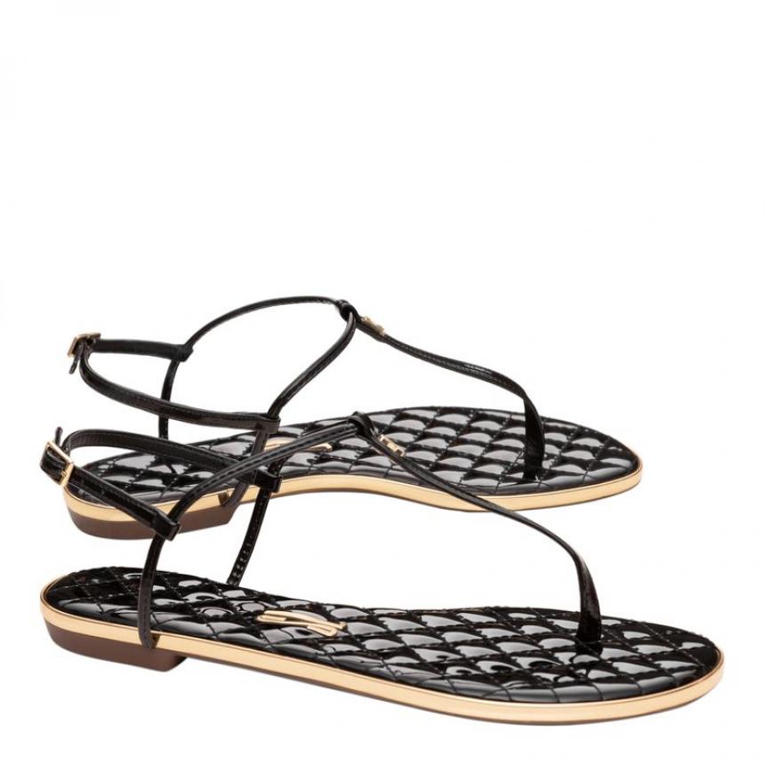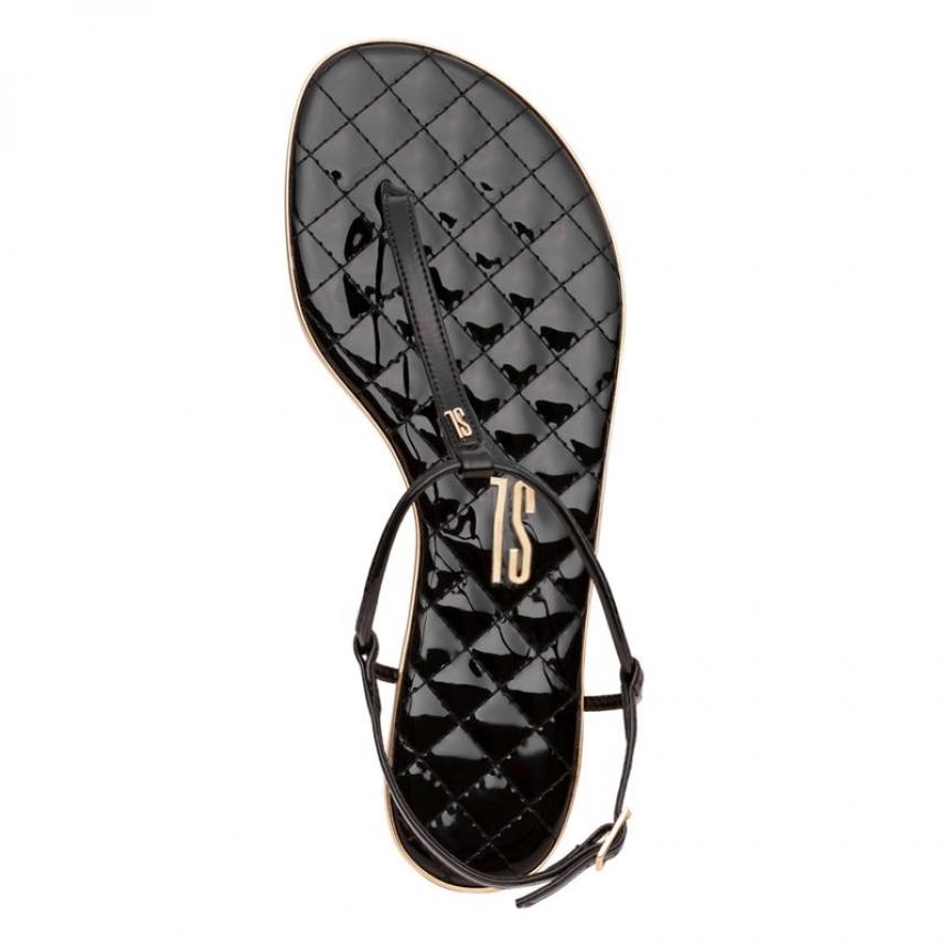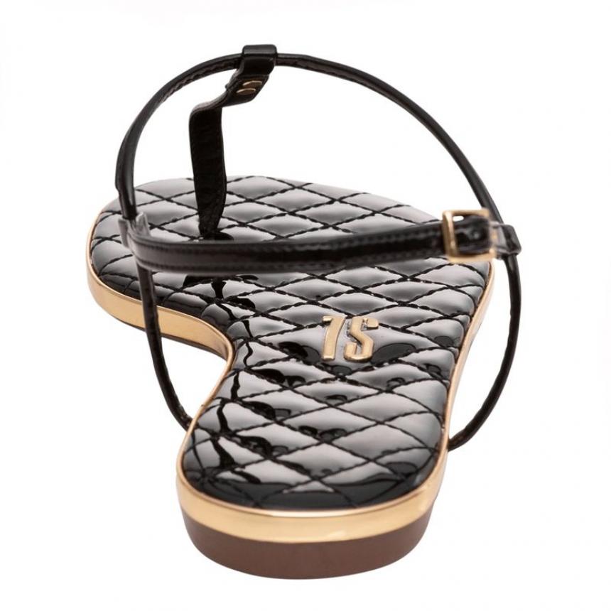 Rasteira matelassê envernizada na cor preta, possui solado flat, bico arredondado, tira fina na parte frontal com fechamento em fivela ajustável no tornozelo. ideal para passeios.