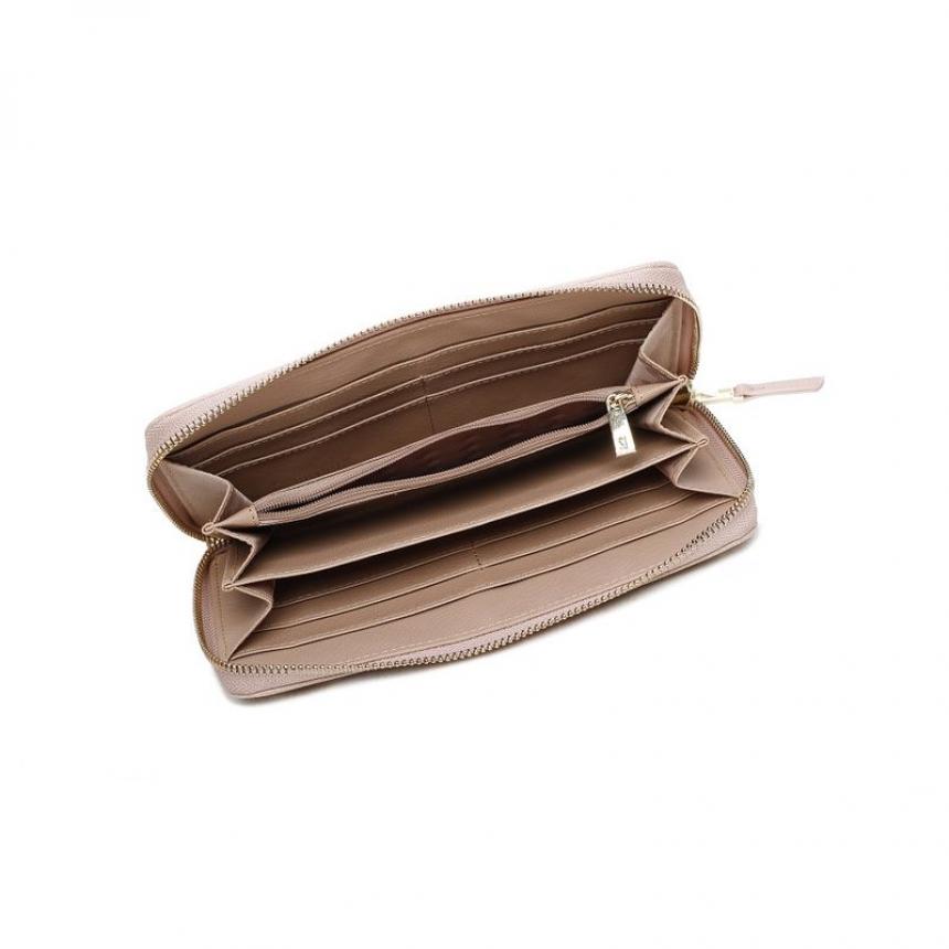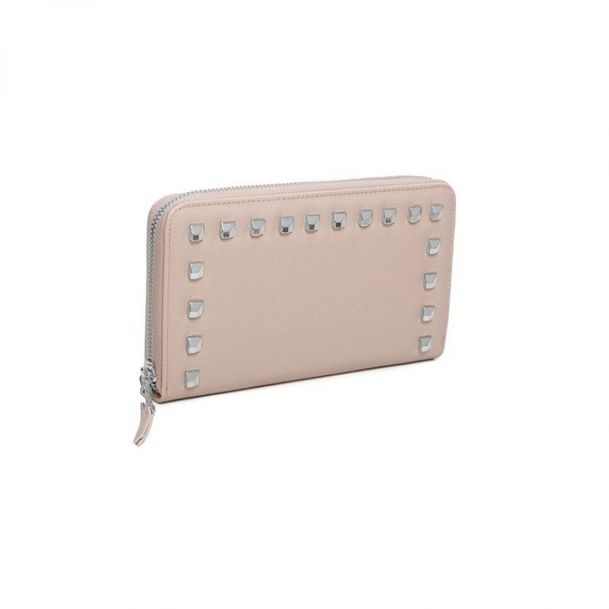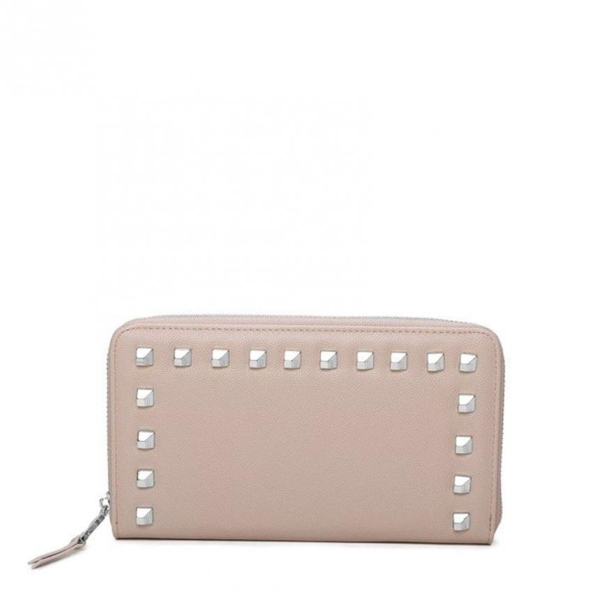 Carteira retangular em material tecnológico na cor nude rosado, possui divisórias para dinheiro, cartões e documentos, detalhe com aplicação de studs e fechamento em zíper.