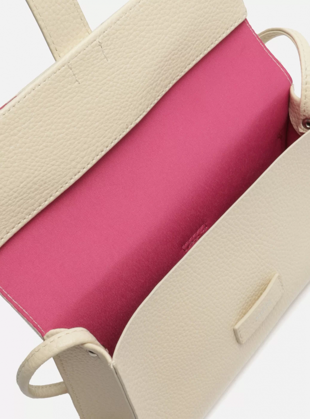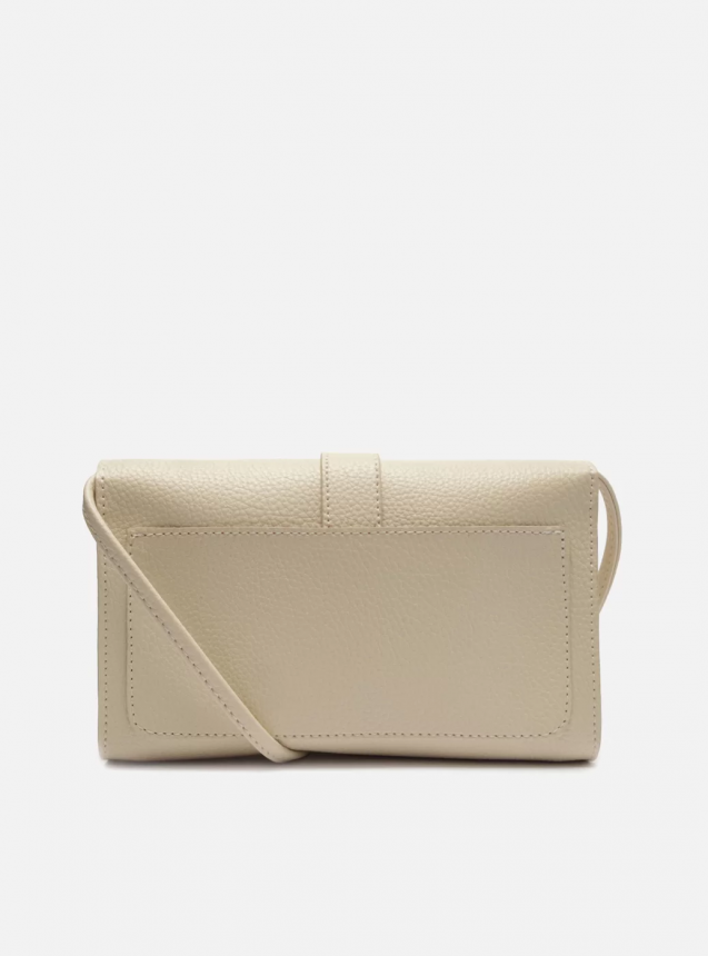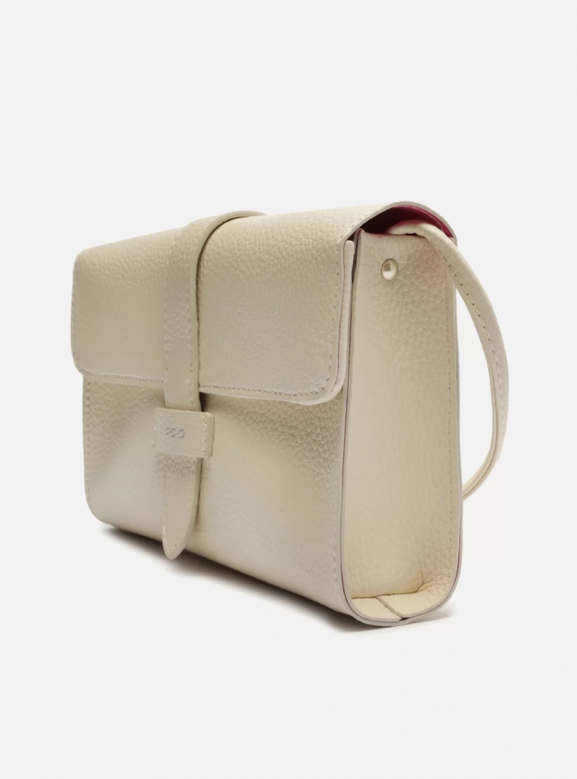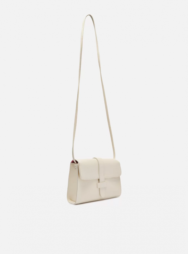 Bolsa tiracolo pequena off-white. O modelo tem formato estruturado e retangular, laterais arredondadas e acabamento texturizado. Traz alça tiracolo em tira fina e longa. Possui fecho em tampo frontal, tira com encaixe e inscrição discreta do nome da marca. Com contorno em costura pesponto e detalhe na parte traseira.