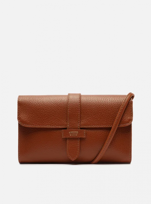 Descrição: Bolsa tiracolo pequena marrom. O modelo tem formato estruturado e retangular, laterais arredondadas e acabamento texturizado. Traz alça tiracolo em tira fina e longa. Possui fecho em tampo frontal, tira com encaixe e inscrição discreta do nome da marca. Com contorno em costura pesponto e detalhe na parte traseira.
