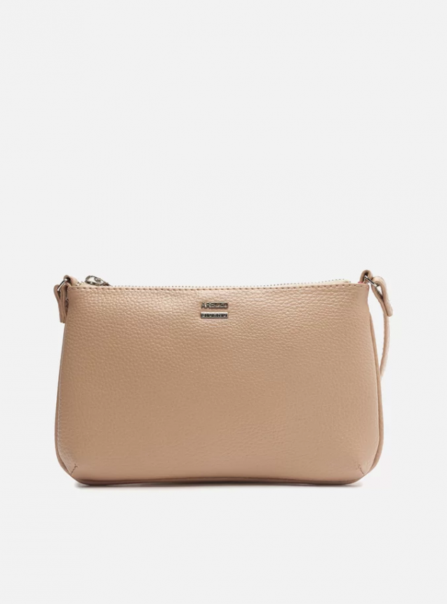 Bolsa tiracolo pequena nude. O modelo tem formato retangular, laterais arredondadas e acabamento texturizado. Traz alça lateral fina e fecho em zíper e puxador. Com inscrição metálica em alto-relevo do nome da marca na capa.