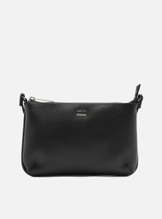 Bolsa tiracolo pequena preta. O modelo tem laterais arredondadas, fecho em zíper com puxador na parte superior e alça lateral fininha. Possui inscrição metálica AREZZO na capa frontal.