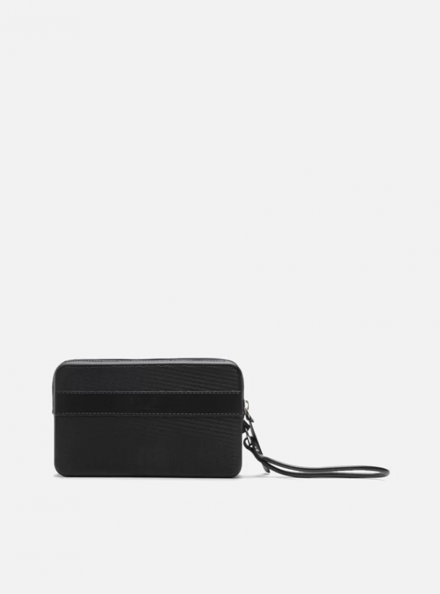 Clutch preta em plástico injetado fosco. O acessório tem formato quadrado e compacto e capas texturizadas, além de faixa lisa com gravação discreta do nome da marca na capa frontal. Traz fecho superior em zíper e puxador emborrachado com inscrição em alto-relevo do nome da marca. Com alça de mão lateral.