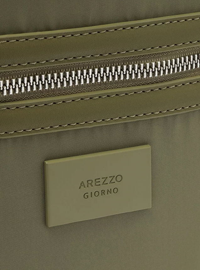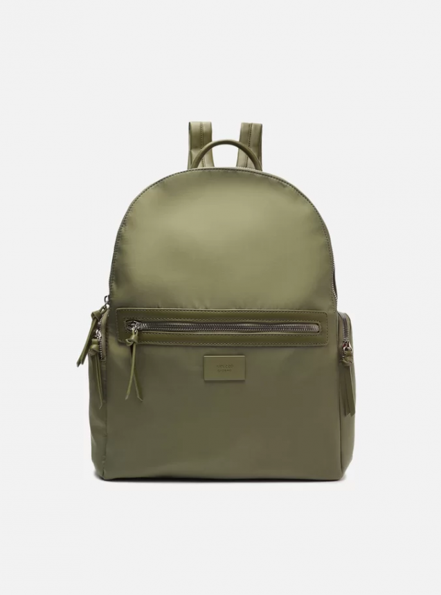 Mochila grande verde em nylon. O modelo tem formato estruturado, alça de mão e duas alças reguláveis na parte de trás. Traz fecho superior em zíper com puxador, dois bolsos laterais e bolso frontal, além de tag do nome da marca. Com bolso interno para notebook.<