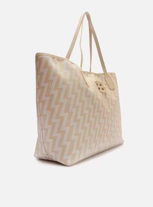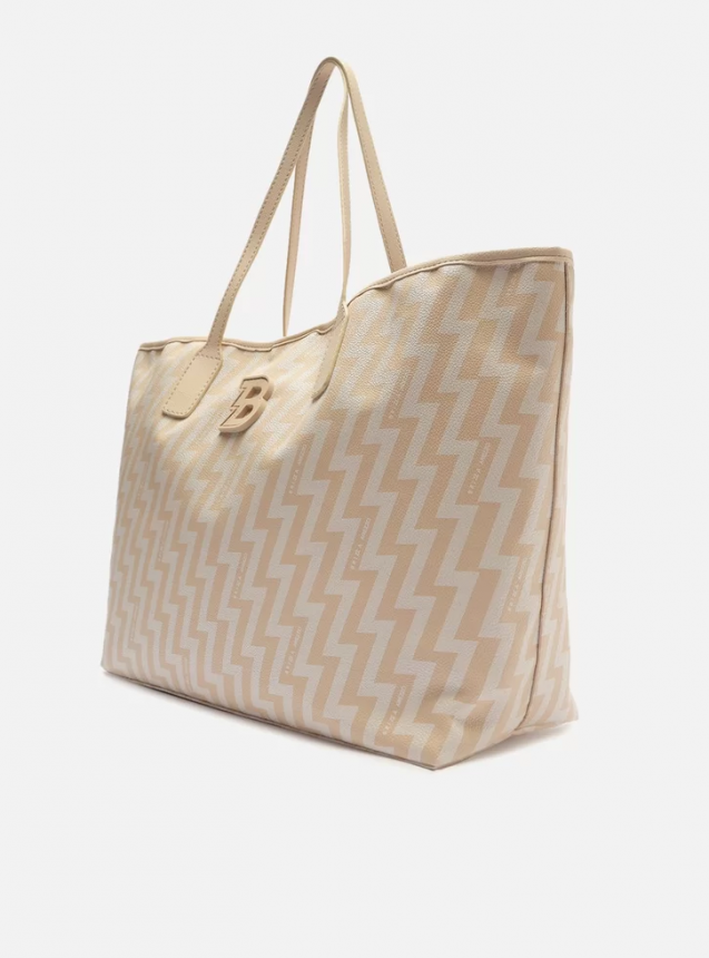 Bolsa shopping grande Off-white com estampa bicolor que remete a raios em forma de Z. O modelo tem formato estruturado e acabamento texturizado. Traz duas alças de ombro. Possui fecho em imã interno. Com aplicação de letra emborrachada B personalizada na capa.