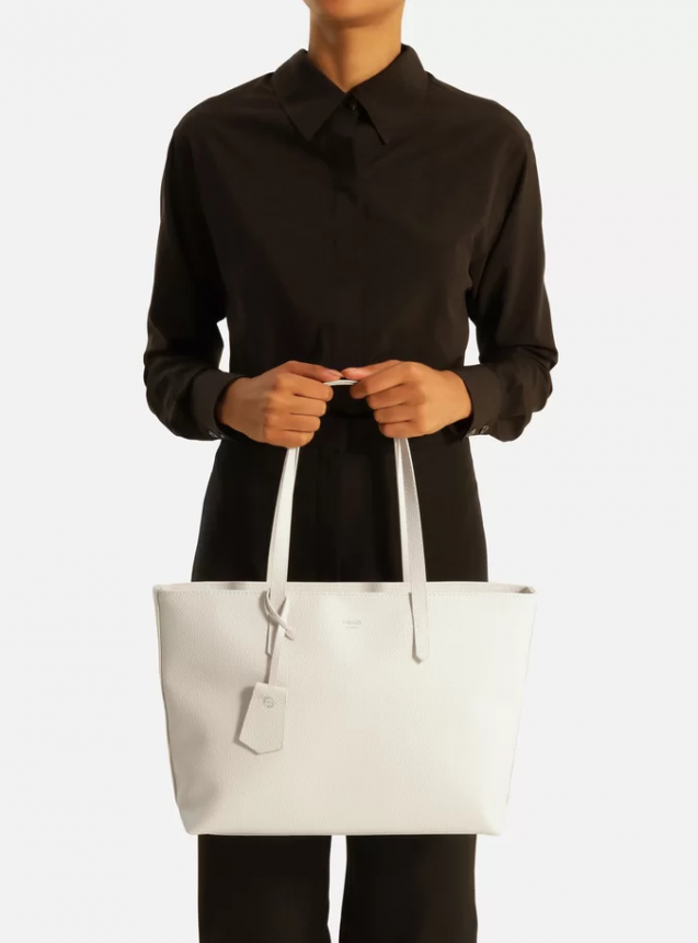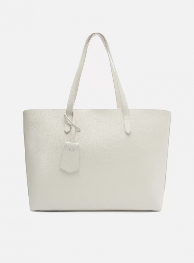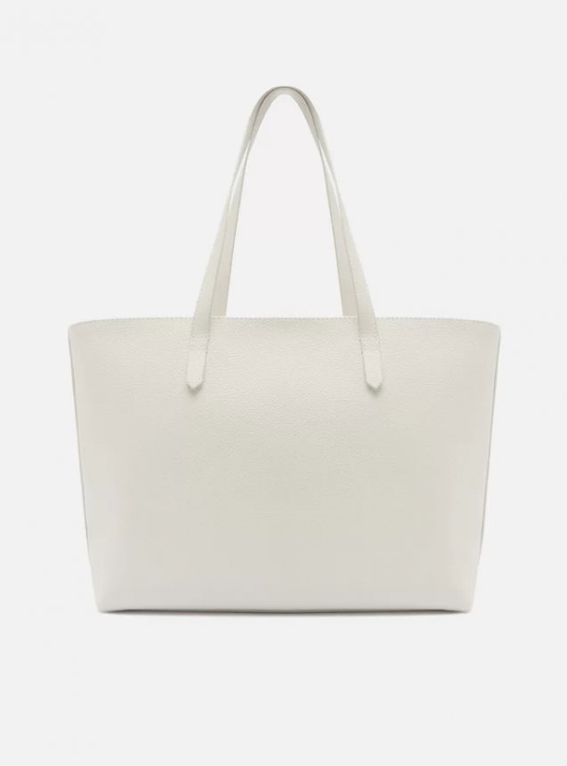 Bolsa shopping grande off white. O acessório tem formato estruturado e acabamento texturizado. Traz duas alças de ombro, fecho superior em zíper e puxador. Acompanha bag charm removível com ID da marca, preso à alça por tira.