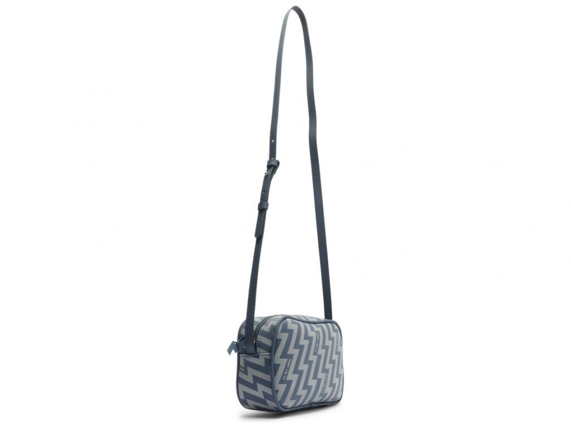 Bolsa tiracolo pequena rosa com estampa bicolor que remete a raios em forma de Z. O modelo tem formato retangular, laterais arredondadas e acabamento texturizado. Traz alça lateral fina regulável e fecho em zíper e puxador. Com aplicação de letra emborrachada B personalizada na capa.
