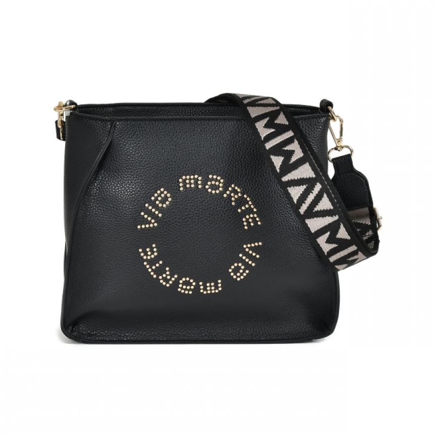 Bolsa Shoulder bag tamanho grande em sintético, no formato retangular com bordas quinadas e afios pintados, com logo via marte em rebites cravejados na capa.
