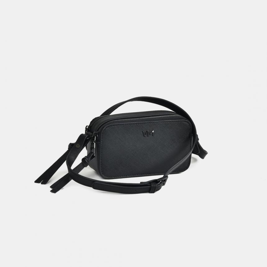Bolsa tiracolo feita em PU com textura saffiano bicolor. Possui dois compartimentos principais. Abertura com zíperes de metal.
