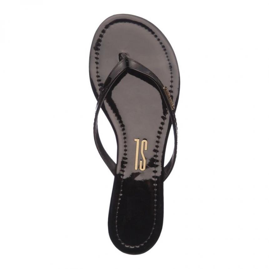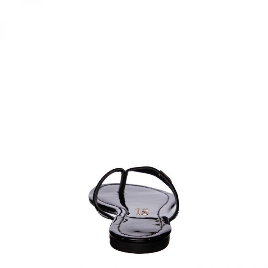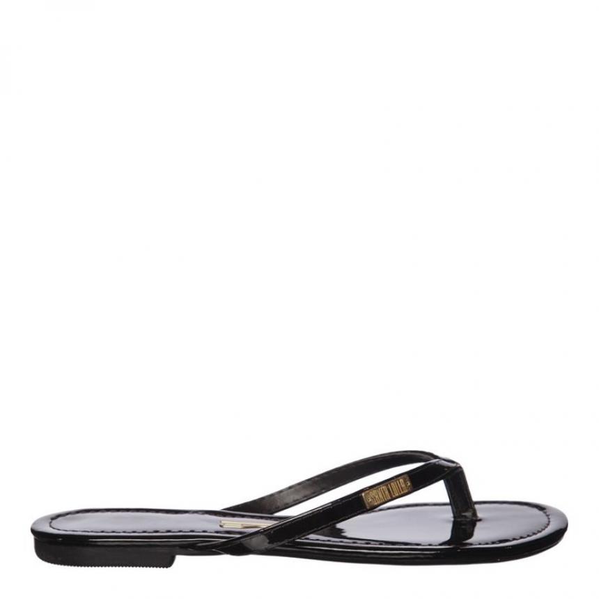 Rasteira envernizada na cor preta, possui salto flat, bico redondo e acompanha linda necessaire.