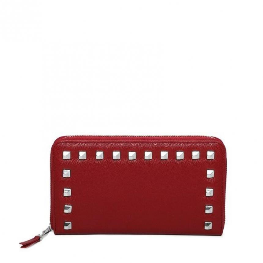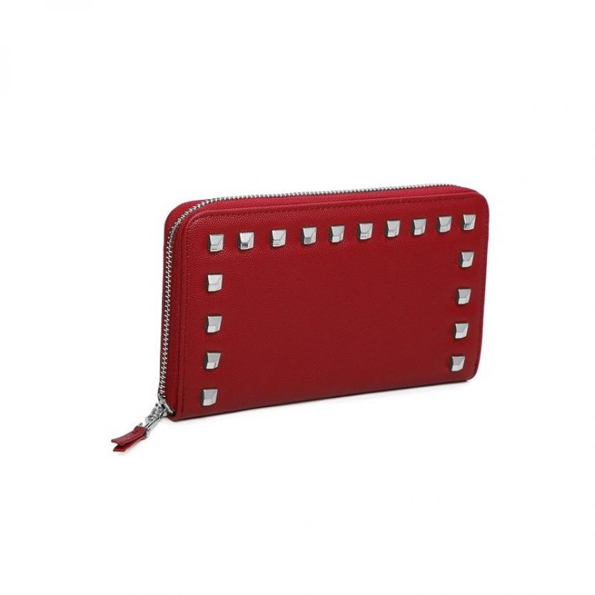 Carteira retangular em material tecnológico na cor vermelho, possui divisórias para dinheiro, cartões e documentos, detalhe com aplicação de studs e fechamento em zíper.