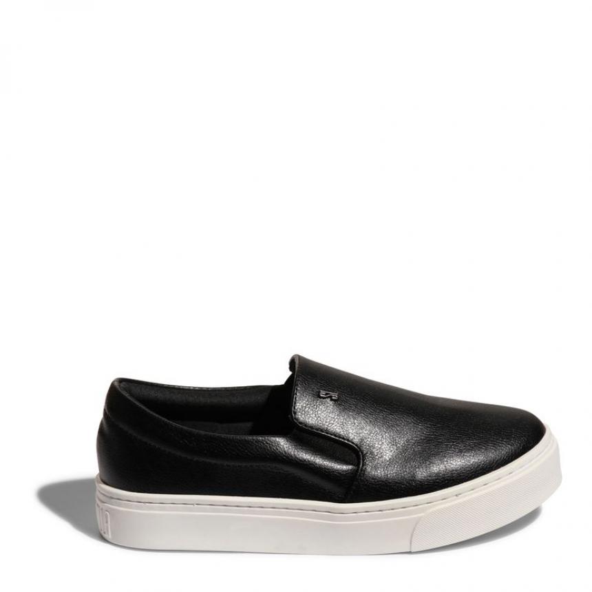 Tênis slip on em material tecnológico na cor preta, possui bico arredondado, caixa baixa, solado branco com escrita atrás e elástico nas laterais para melhor conforto ao calçar. Lindo e estiloso, ideal para compor looks mais casuais.