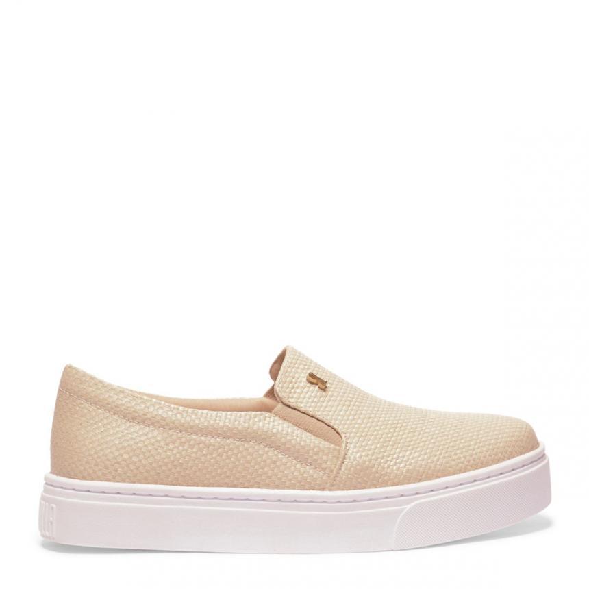 Tênis slip on feminino confeccionado em têxtil. Possui bico redondo e salto baixo flat. Nas laterais possui elástico para facilitar o calce. O tênis slip on é um calçado prático, confortável e versátil, é um calçado que combina bem com diferentes estilos de roupas, como jeans, shorts, vestidos ou saias.