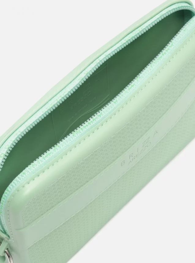 Clutch Verde em plástico injetado fosco. O acessório tem formato quadrado e compacto e capas texturizadas, além de faixa lisa com gravação discreta do nome da marca na capa frontal. Traz fecho superior em zíper e puxador emborrachado com inscrição em alto-relevo do nome da marca. Com alça de mão lateral.