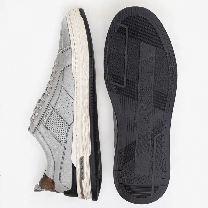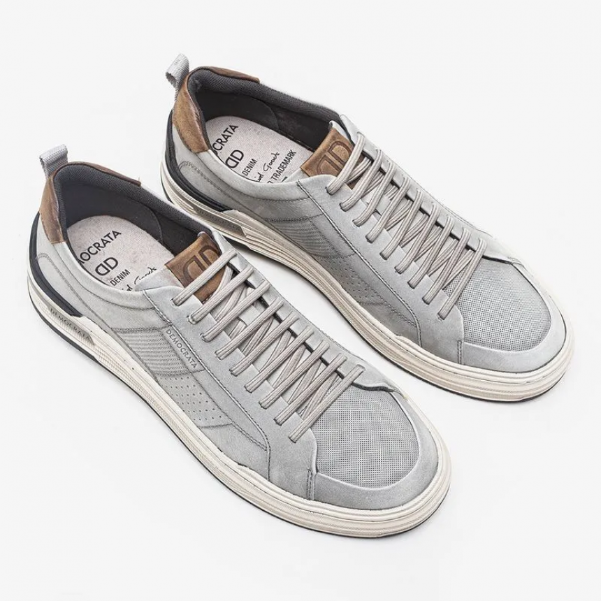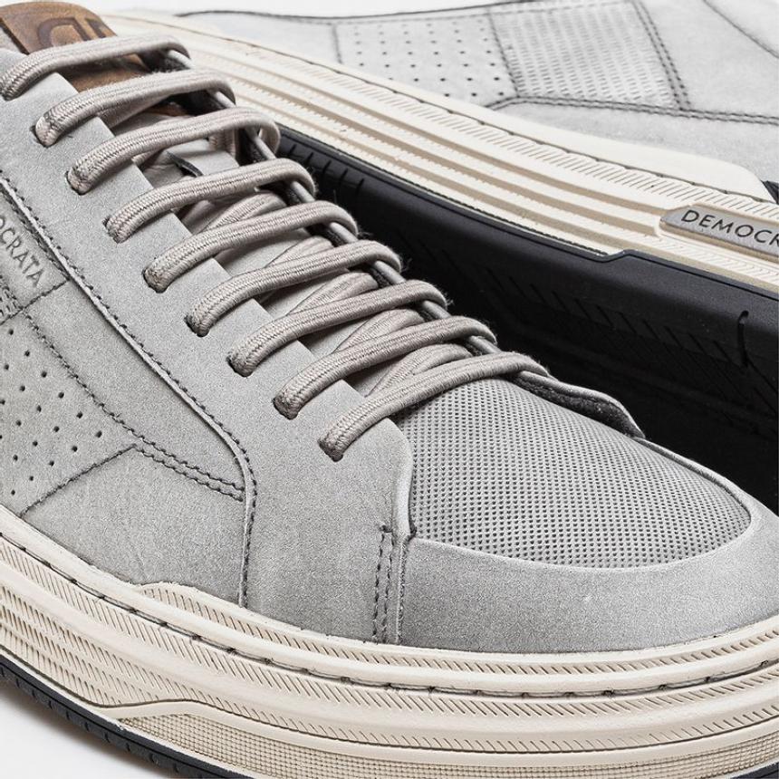 O Sapatênis Denim Mike é confeccionado em couro na cor Cinza Cloudy com recortes nas laterais. Possui fechamento em cadarço de elástico, facilitando o calce, logo da marca na língua e detalhe de couro marrom no calcanhar com puxador de tecido. Seu solado é de borracha na cor bege com detalhe preto no calcanhar e blaqueada na lateral, além de contar com uma palmilha macia de p.u com forro de tecido e bico arredondado.