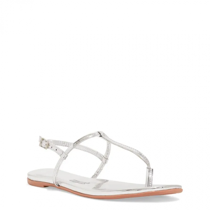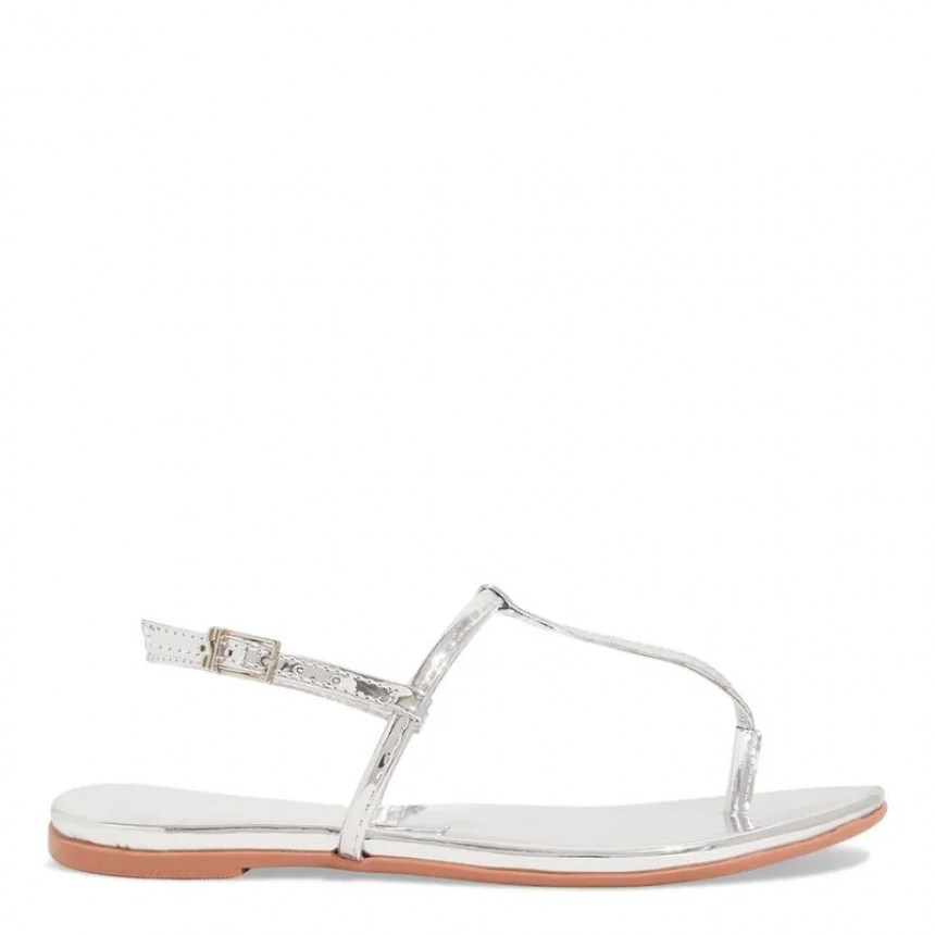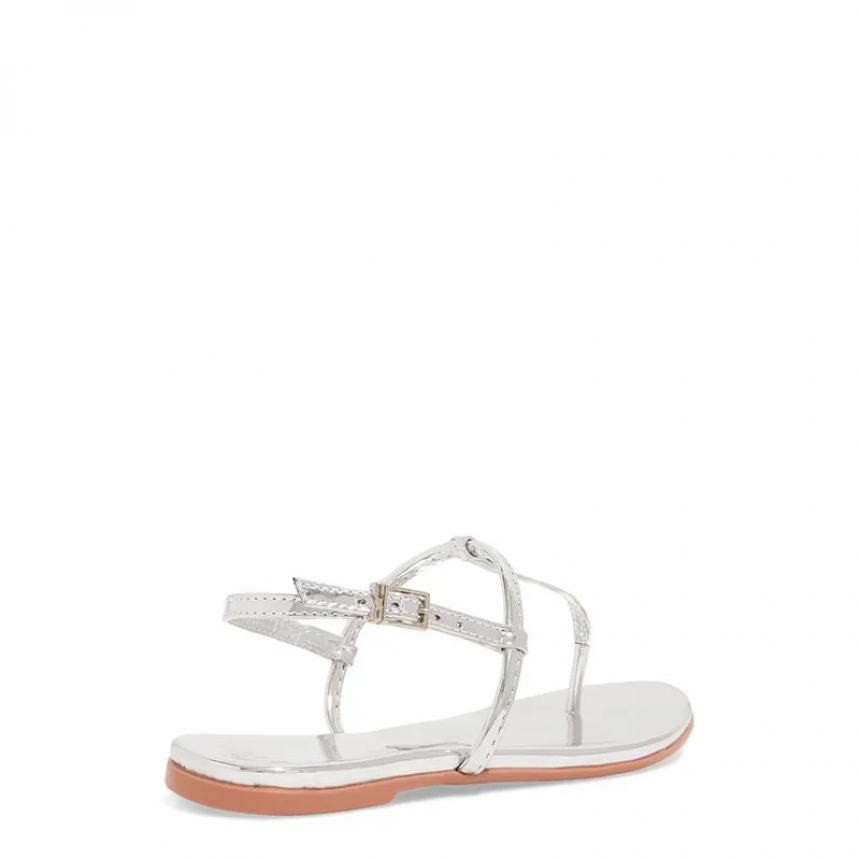 Rasteira confeccionada em material metalizado com acabamento espelhado, design de bico redondo e salto flat, possui tiras finas e fechamento em fivela com detalhe SL.